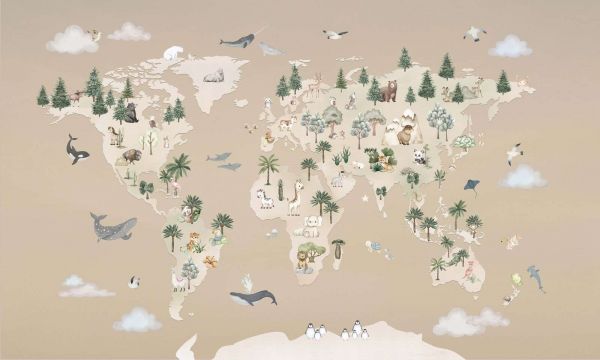 This atmospheric illustration shows a world map in which animals from every corner of the world have their own place. On the different continents recognizable species appear, such as giraffes, pandas, bears, kangaroos and llamas, while in the surrounding seas whales, dolphins and rays swim calmly by. The whole is rendered in warm sand and beige tones, combined with soft greens and subtle gray-blue accents. This creates a harmonious and inviting appearance that feels both playful and calm. Inside a bohemian interior, this map can be beautifully combined with natural materials such as rattan, linen and lightly weathered wood. Think of a low cabinet with woven baskets, plants in terracotta pots and cushions with botanical prints. In a modern classic interior, the map forms a warm accent when combined with elegant furniture in cream or taupe tones, a soft rug and accessories in gold-colored or bronze hues. The subtle patterns of trees, mountains and ocean waves give the image depth without becoming crowded. Therefore this illustration fits perfectly in a children's room, play corner or study nook where a calm, inspiring atmosphere is desired. Also in a living room or hall, the design can add a friendly and worldly touch. By choosing accessories in natural colors such as sage green, sand and light wood, a balanced whole emerges in which the adventurous character of the map comes forward nicely.