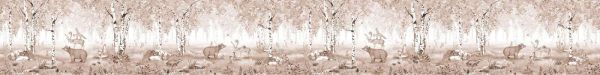 This enchanting forest landscape captures the calm and beauty of nature in a stylish monochrome palette of warm sepia tones. In this atmospheric scene you walk through a birch forest full of life: bears wander calmly, deer look curiously, badgers, rabbits and squirrels move among the shrubs. The trees rise high, with subtle leaf patterns that suggest softly filtered light, while the forest floor is filled with low vegetation and natural details. Thanks to the use of only one color tone this design has a classic, nostalgic look that perfectly fits rural or vintage interior styles. In a child's room it provides a calm and natural background that works soothingly, without distraction. Pair with furniture in natural wood, soft fabrics in cream or rust brown, and accessories of wool, felt or rattan for a harmonious whole. Also in a reading nook, hallway or even a quiet workspace this design comes into its own. The warm hue creates a cozy atmosphere that invites relaxation. Think of combinations with leather chairs, linen curtains or a soft wool rug to reinforce the natural character. The illustration style is detailed and refined, with an even balance between the animals, trees and surroundings. The sepia color usage makes this design versatile and timeless, while it still adds character and depth to the space. Ideal for anyone who wants to combine a love of nature with a sense of style and calm.