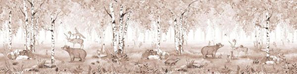 In terms of color usage, the design remains in a harmonious palette of browns, beiges and cream shades, with light shading to create depth. The birch trees provide vertical lines and rhythm, while the playfully placed animals bring the whole to life. This pattern is ideal for those seeking a natural and narrative atmosphere with a timeless character.