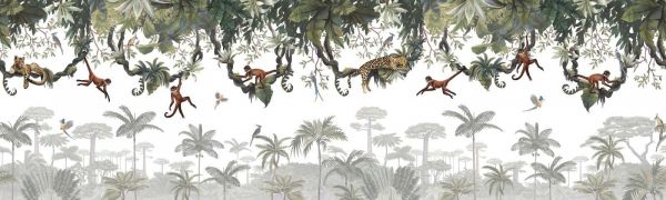This playful and lively illustration takes you to the height of the tropical rainforest, where monkeys swing on vines, leopards relax on thick branches, and exotic birds flutter among the lush green. The top half of the image is richly filled with tropical leaves, tendrils and plants, while the bottom half provides more air and space with a subtly drawn palm forest in the background. The color usage is fresh and balanced: rich greens in the canopy are combined with warm browns and orange nuances in the animals, and accents of bright blue and yellow in the birds add a lively touch. The contrast between the full upper part and the light lower part gives the whole a spacious and airy look, making it not too busy. This design fits excellently in a bohemian or eclectic interior, where natural elements and color play an important role. Think of a playful children's room with wicker baskets, a rattan cradle and colorful cushions, or a tropical corner in the living room with many plants, wooden furniture and accessories made of bamboo or linen. The tropical atmosphere makes it ideal for spaces where imagination and adventure may live, such as a playroom, children's room or even a home office that should stimulate creativity. The combination of animals, plants and airy structure creates a spatial effect with much depth. The dynamism of the climbing monkeys, the relaxed character of the leopards and the graceful birds bring energy and balance together in one image – perfect for those seeking a lively, natural and yet calm atmosphere.