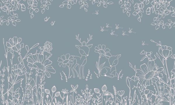 This refined illustration shows an idyllic nature scene in which two deer stand and lie quietly among tall wildflowers. Around them appear subtle details such as butterflies, bees and small forest animals, giving the image a lively yet soft appearance. The style consists of elegant white line drawings on a gray-blue background, creating a minimalist and harmonious contrast. The botanical patterns of leaves, flower buds and slender stems provide a playful rhythm and give the whole a calm, airy atmosphere. In a Scandinavian interior this illustration comes beautifully into its own in combination with light woods, soft fabrics and natural colors such as cream, sand and light gray. Think of a simple bed frame, a woolen plaid and some ceramic accessories. Within a modern botanical interior the design can be enhanced with plenty of greenery, rattan accents and furniture with organic shapes, thereby further emphasizing the natural character. Because of the calm composition and the subtle line work, this illustration is particularly suitable for a children's room, nursery or quiet bedroom, where a relaxed and dreamy atmosphere is desired. Also in a work or reading corner the design can form a refined and inspiring accent. Pair with accessories in sage green, powder blue or warm beige to create a harmonious and balanced whole.