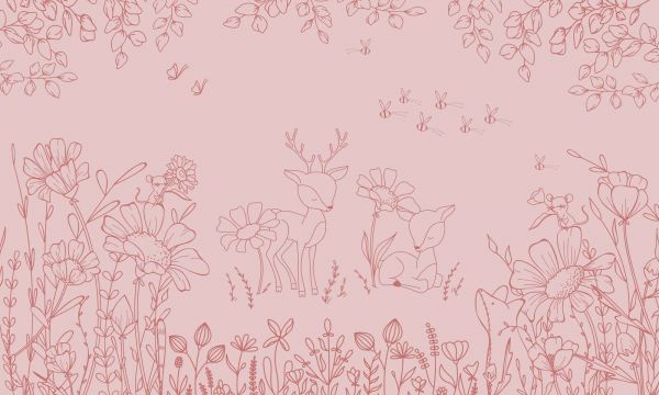 This elegant illustration shows a peaceful natural scene in which two fawns are located among tall flowers, slender plants and small woodland creatures. Butterflies and bees flutter playfully through the air, while the botanical details contribute to a lively yet subtle whole. The illustration style consists of fine line drawings in a warm rose tint on a soft pink background. This tone-on-tone color style creates a harmonious and friendly image with a romantic and refined character. Within a romantic interior this illustration can be beautifully combined with light furniture, soft fabrics and accessories in tones such as cream, powder pink or gold. Think of a round rug, graceful wall decoration or a small wooden cabinet with rounded shapes. In a Scandinavian interior the design forms rather a subtle color accent next to minimalist furniture, light woods and natural materials such as linen and wool. The organic patterns of flowers, leaves and fine animal figures bring depth and movement without looking restless. As a result, this illustration is particularly suitable for a nursery, children's room or tranquil bedroom, where a secure and dreamy atmosphere is desired. Also in a reading corner or creative space the design can add a soft and inspiring element. By choosing accessories in tones such as beige, soft green or warm pink, a harmonious whole arises that radiates calm and gentleness.