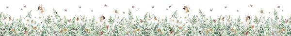 This elegant design brings a lush meadow of flowers to life with an abundance of soft green tones, natural accents and warm pastels. Among the fresh green leaves, ferns and stems bloom various wildflowers such as daisies, oxeye daisies, poppies and wood hyacinths. Here and there you can see bees taking nectar, while butterflies flutter calmly in the air above. The style is refined and airy, with lots of open space upward. The combination of soft brushstrokes and subtle color nuances makes this design particularly calming and pleasant to the eye. The color scheme is natural and fresh: light green, olive green, beige, soft pink and warm white form a harmonious whole. In a children's room or nursery, this design creates a dreamy, calm atmosphere with a touch of playfulness. Pair it with light wood furniture, textiles in linen or cotton, and accessories in earthy tones or soft pink for a natural look. Also in a bohemian or country interior, this design comes into its own, for example as an accent wall behind a bed or dresser. The pattern is rich in detail without feeling crowded, making it suitable for both small and large spaces. The presence of insects such as bees and butterflies adds a lively element without making the overall look restless. This flower meadow brings the beauty of nature indoors and creates a fresh, cheerful and calming atmosphere.
