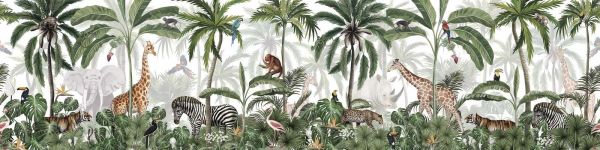 An exotic rainforest full of palm trees and tropical plants, with zebras, giraffes, tigers, elephants, toucans and parrots. Vibrant colors and rich details bring this jungle full of adventure to life.