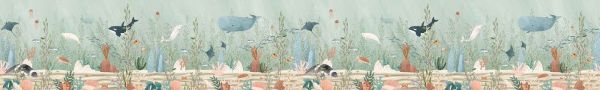 A colorful underwater world with orcas, whales, dolphins, turtles and playful fish among coral, seaweed and shells. Soft colors and playful details bring the seabed to life.