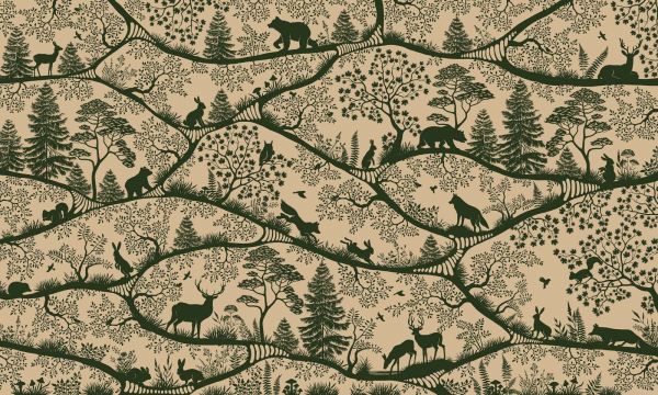 A stylish woodland design with silhouettes of deer, bears, wolves and rabbits among graceful branches and fine natural details. The deep moss green on a warm beige background creates a calm and natural look.