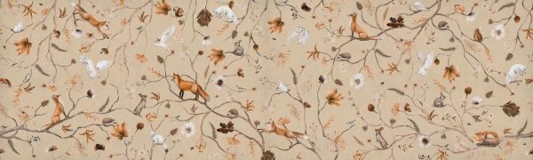 Dit charmante ontwerp toont een fantasierijk bos vol kleine taferelen van dieren die zich tussen sierlijke, dunne takken bewegen. Vossen, uilen, konijnen, eekhoorns, wezels en zangvogels duiken her en der op tussen de bladeren en bloemen in zachte bruintinten, oranje accenten en ivoorwit. De warme beige achtergrond geeft het geheel een natuurlijke, rustige basis, terwijl het gedetailleerde lijnenspel van de takken en de fijne illustraties zorgen voor een elegante en levendige sfeer.