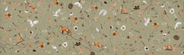Dit warme en speelse tafereel brengt een levendig boslandschap tot leven, met een rijke verzameling dieren die zich verstoppen, rusten en spelen tussen sierlijk vertakte bloemen en bladeren. De vossen springen en sluipen, witte uilen zweven lichtjes over de compositie, terwijl konijnen, wezels, eekhoorns en zangvogels subtiel verspreid zitten tussen de bloemen in zachte bruin-, roest- en crèmetinten. De achtergrond is een zachte olijfgroene kleur die perfect contrasteert met de warme tinten van het bladerdek en tegelijkertijd rust en verfijning uitstraalt.