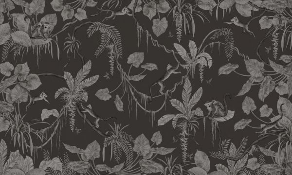 This intriguing design captures the feeling of a tropical rainforest at night. Against a deep black background, a jungle life unfolds in refined shades of gray, where monkeys move gracefully among lush leaves, winding vines, and blooming heliconias. The monochrome style enhances the mysterious character of the design: rich in details, yet understated and stylish. The monkeys bring dynamism to the whole - they swing, rest, and explore the canopy, while tropical birds and butterflies also appear among the branches, subtly integrated into the composition. Perfect for a modern chic or luxurious botanical interior, where deep colors, texture, and contrast come together. Combine this design with velvet fabrics, dark woods, brass accents, or natural stone to create a sophisticated, atmospheric space. This design shines beautifully as an accent wall in a living room, bedroom, or stylish office space. In a restaurant or hotel room with character, it makes a powerful yet calming statement. The dark background creates an intimate, almost theatrical atmosphere that envelops and stimulates. For those who love a bold design with natural elegance, this is a unique choice: jungle, but with a mature, sophisticated twist. A visual still life that continues to captivate.