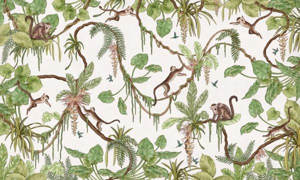 This cheerful and playful jungle design brings a tropical rainforest to life with energetic monkeys, large leaves, and colorful flowers. The fresh white background enhances the rich green tones of the canopy, while the brown vines and branches provide a natural balance. The monkeys are depicted in various poses - climbing, jumping, resting - making the image dynamic and lively. Floating among the greenery are small tropical birds that add a light and playful touch to the overall scene. The illustration style is friendly and detailed, with a botanical foundation but a child-friendly tone. The composition is kept airy, ensuring the design does not appear too busy and brings a sense of calm to the space.