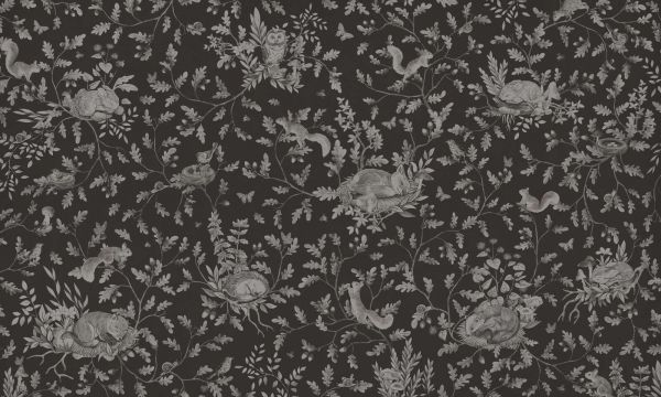 This design captures the magical atmosphere of the forest as night falls. Against a deep black background unfolds a detailed and quiet scene: rabbits safely sleeping on a bed of leaves, squirrels hidden among branches, birds in their nests, and a wise owl watching from its branch. Oak branches with leaves and acorns twist through the image, framed with flowers, butterflies, and small forest details in soft gray tones. The limited, monochrome color scheme makes this design powerful and serene. The contrast between the black background and the finely detailed animals and plants in gray tones creates a subtle yet striking depth. This makes it perfect for a modern rustic interior, or as a playful accent in a dark, cozy children's room. The animals are peacefully sleeping or keeping watch, giving the pattern a calm aura. The illustrative style feels hand-drawn, with great attention to detail, making the whole seem to tell a story – quiet, soft, and comforting. The repetition of the oak branches provides rhythm, while the variety of animals and plants keeps the design lively. Ideal for spaces where you want to evoke a cozy, warm atmosphere: a bedroom, reading nook, play area, or even a creative workspace. Combine this design with warm grays, deep green tones, wood accents, and soft textures like wool or velvet for a rich and inviting whole. Also beautiful when paired with midnight blue or copper-colored accessories for an extra layered look.