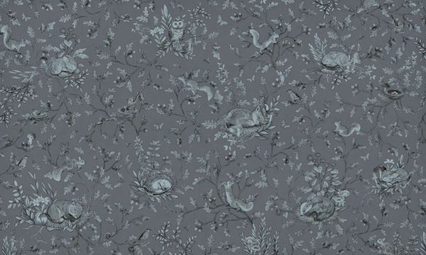 This dreamy design brings a calm forest world to life in atmospheric blue tones. Against a soothing blue-gray background, graceful oak branches with acorns, leaves, and flowers unfold, in which various forest animals have found their place. Sleeping rabbits rest on beds of leaves, squirrels playfully climb through the branches, owls keep watch quietly, and little birds sleep safely in their nests. Subtle butterflies flutter everywhere and small forest details can be discovered, such as mushrooms, snails, and bees. The colors are kept tonal, with soft grayish blues that harmonize perfectly with each other. This creates a particularly serene look, ideal for a minimalist children's room or a modern, calming bedroom. The cool colors bring cooling and calmness, while the detailed pattern still maintains a warm, inviting atmosphere. Thanks to the subtle shades, the overall look never appears busy, but remains visually engaging. The composition is open and airy, allowing the design to shine beautifully on larger surfaces. The illustrative style - with fine lines and soft shadows - evokes classic picture books and invites you to daydream in a quiet world full of forest magic. Perfectly combinable with natural materials such as gray wood, light linen, or felt accessories. Think of a crib with soft blue bedding, sand-colored curtains, or a woolen throw in silver-gray. Also beautiful in combination with midnight blue or light pastel blue for a tonal look that exudes peace and security.