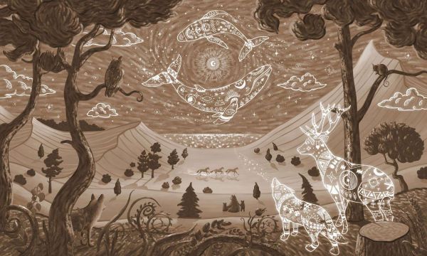 This distinctive design takes you to a magical night landscape where nature and fantasy come together. Rolling hills, winding trees and a glistening horizon form the backdrop for beautifully illustrated animals such as deer, wolves and whales. Their bodies are filled with refined patterns and symbolic shapes that give the whole a playful and almost spiritual look. In the middle of the starry sky, graceful whales seem to float around a radiant moon, surrounded by small stars and soft clouds. This dreamy composition creates a sense of wonder and calm. Through the use of warm sepia, beige and brown tones, the design gains a natural and timeless atmosphere that adds warmth to every space.